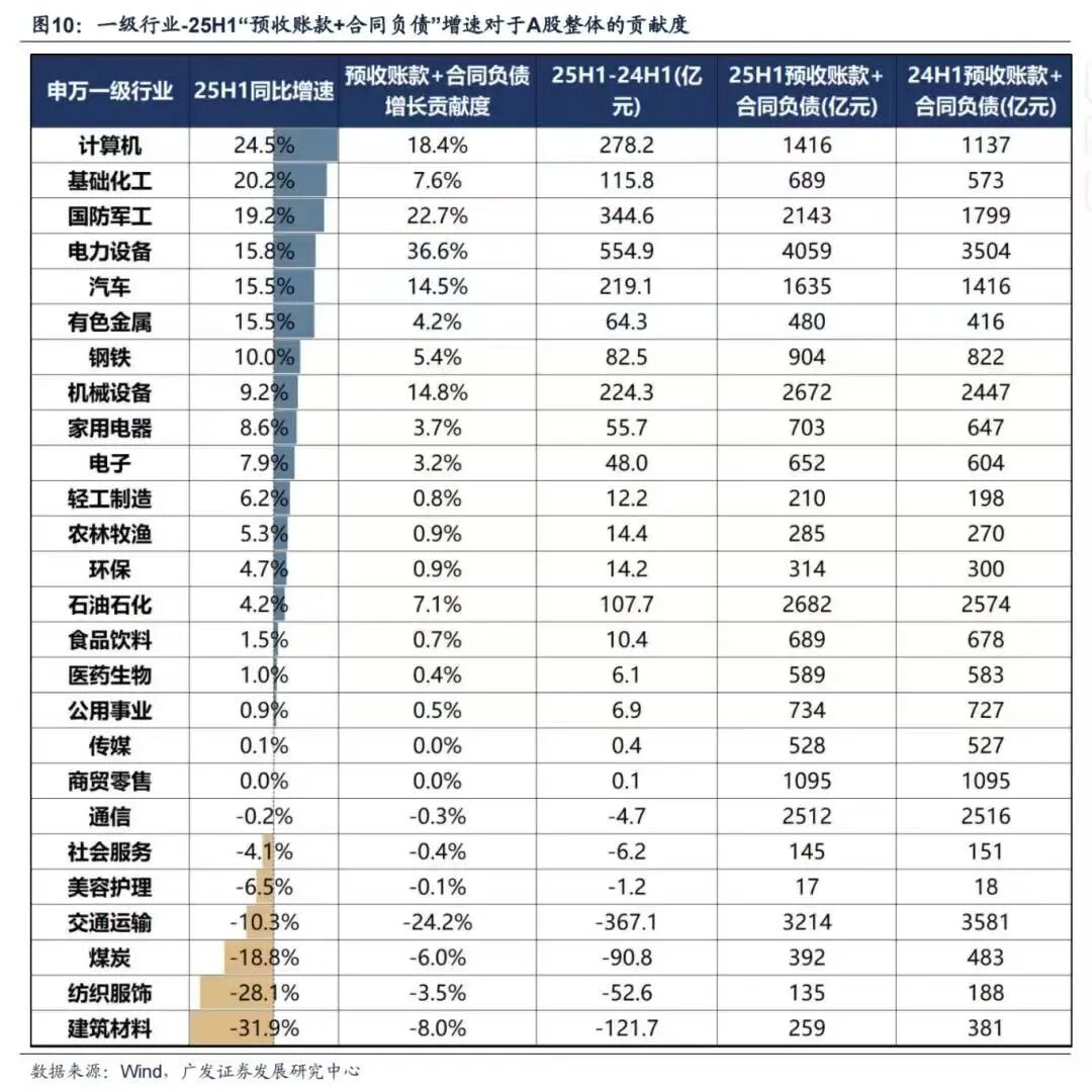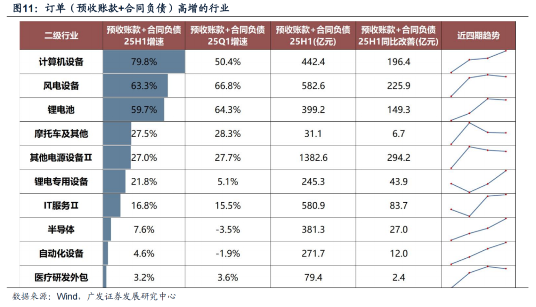 广发证券发布研报称,随着A股中报披露完毕,本次中报总量维度上出现值得关注的积极变化。A股订单指标延续改善,其中H1同比增速较高、增长贡献度较高的 一级行业是:计算机、基础化工、国防军工、电力设备、汽车。除了市场认知较充分的订单高增的AI算力外,该行也进一步考察了其他行业,筛选25H1订单增速同比高增的行业:风电(电缆/风机/塔筒桩基)、锂电池、锂电设备、摩托车、半导体(设备)、CXO、自动化设备(如3C设备)、其他电源设备、IT服务、计算机设备。
