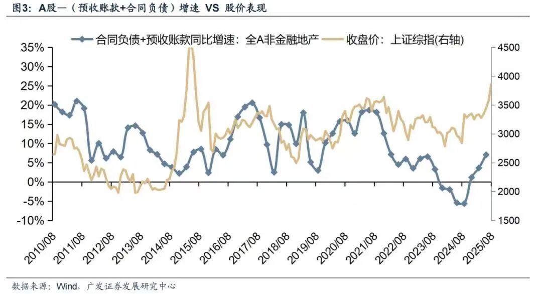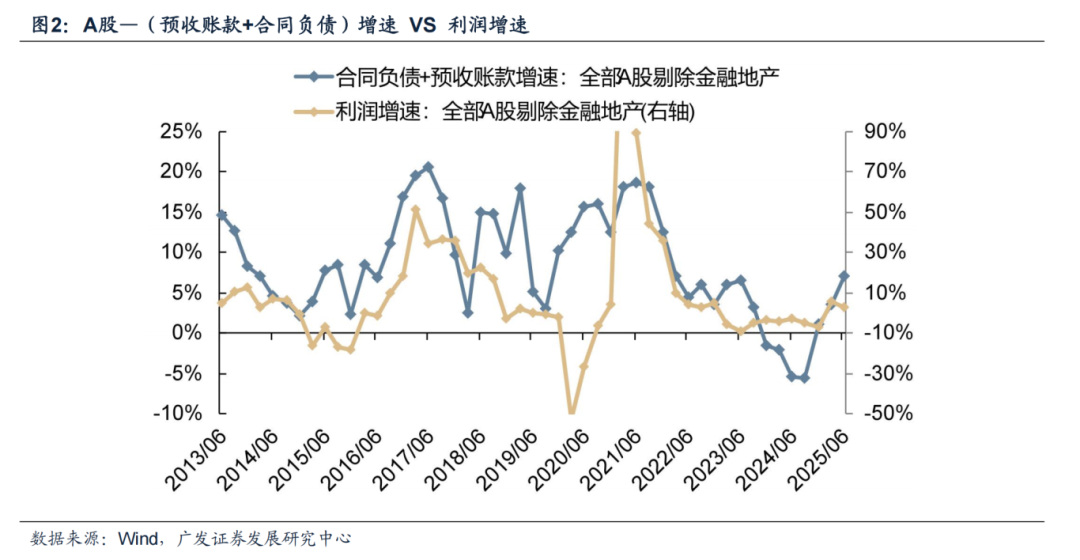 在A股及典型制造行业中,历史上【预收账款+合同负债】同比增速与“利润增速”存在正相关性。更进一步,对A股总体、及制造业的股价表现也有指示意义。
