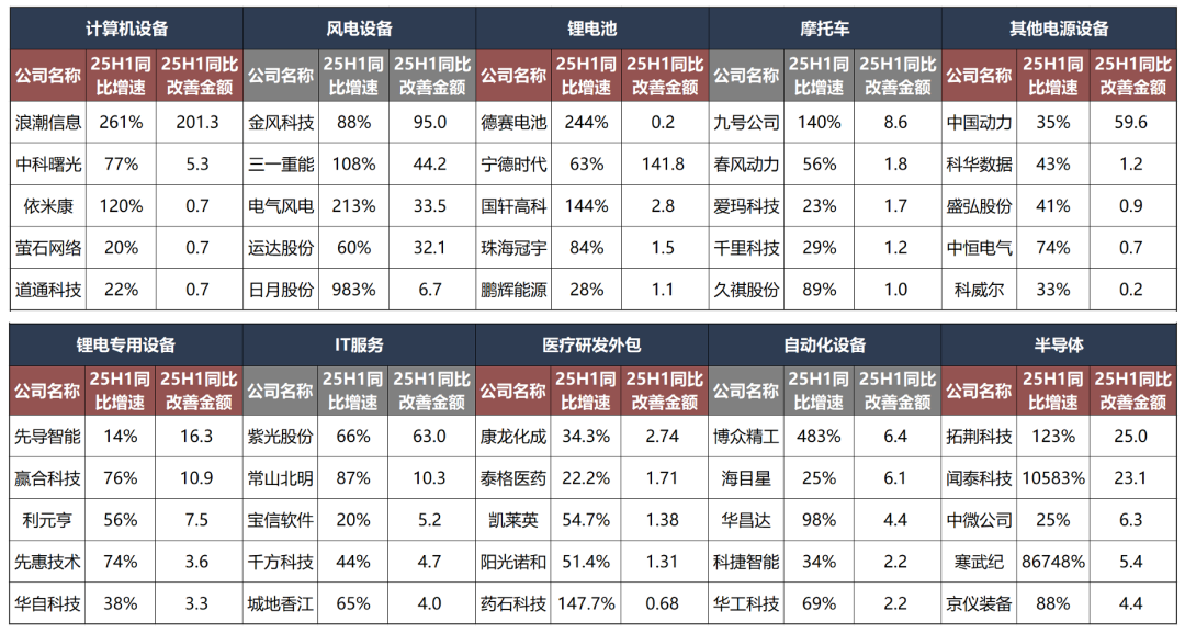 除了市场认知较充分的订单高增的AI算力外,该行也进一步考察了其他行业,筛选25H1订单增速同比高增的行业:风电(电缆/风机/塔筒桩基)、锂电池、锂电设备、摩托车、半导体(设备)、CXO、自动化设备(如3C设备)、其他电源设备、IT服务、计算机设备。