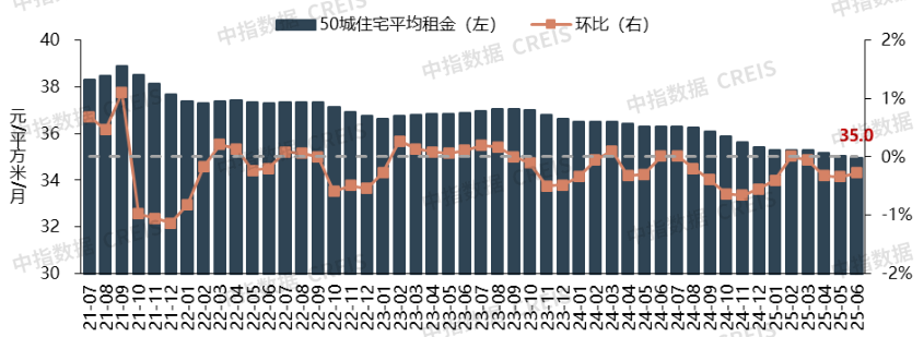 图:2021年7月至2025年6月50城住宅平均租金及环比涨跌