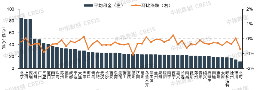 图:2025年6月50个城市住宅平均租金及环比涨跌