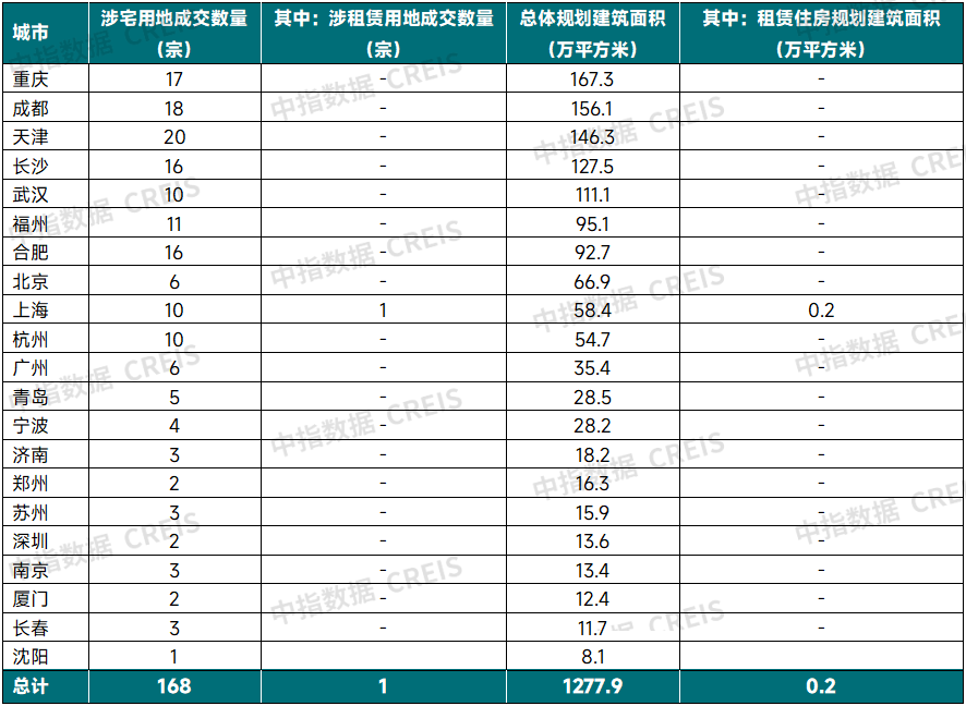 2025年6月,重点22城共成交168宗涉宅用地,总体规划建筑面积约1277.9万平方米,重庆成交规模居首。具体城市来看,重庆成交规模167.3万平方米,成都、天津、长沙、武汉成交规模均超100万平方米,福州、合肥、北京、上海、杭州成交规模在50-100万平方米之间,其余城市成交面积不足50万平方米。