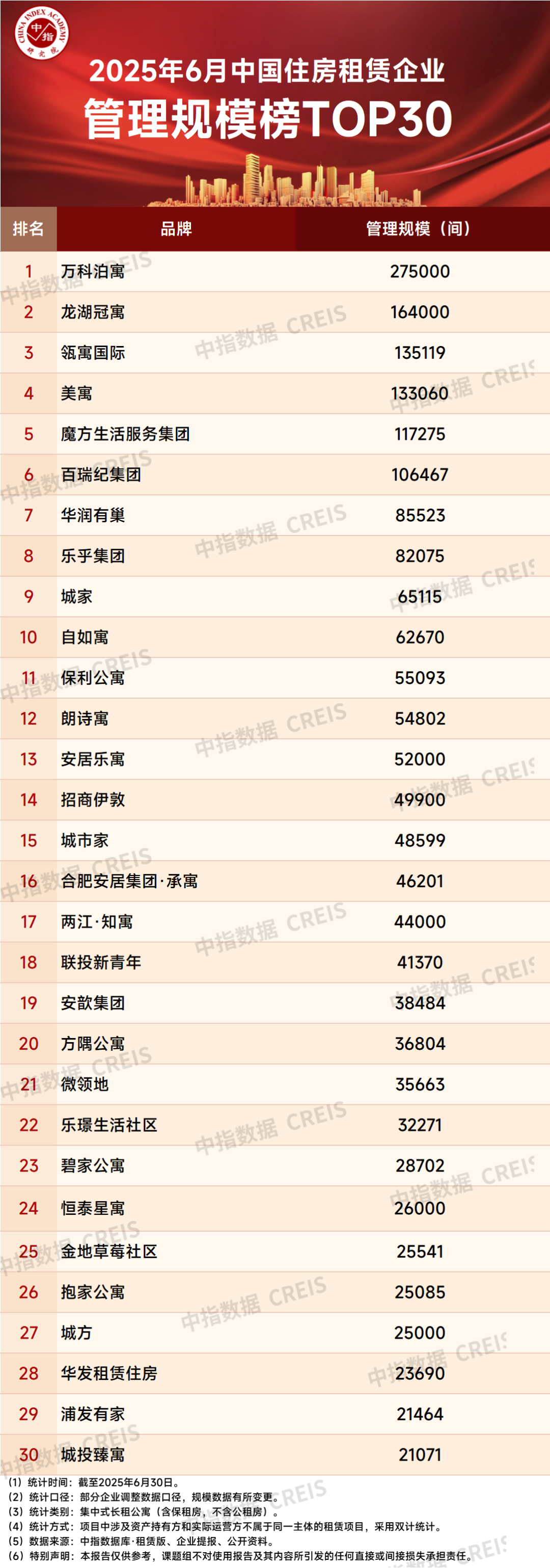 据中指研究院统计,2025年6月,TOP30集中式长租公寓企业累计管理房源量达195.8万间,较5月增加约3.5万间。